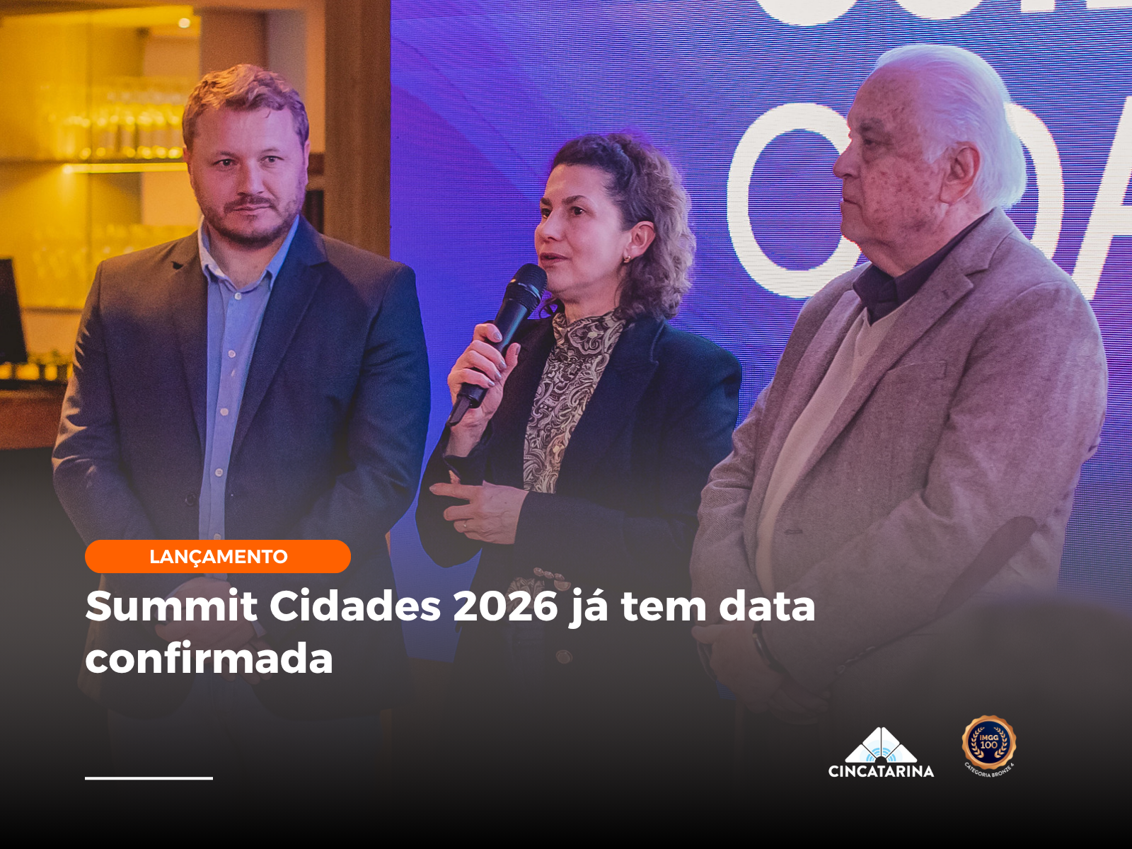 O Summit Cidades já tem data para a sua 5ª edição: 23, 24 e 25 de junho de 2026, no Centrosul, em Florianópolis. O anúncio foi feito pelos organizadores do evento – FEPESE, representada pelo presidente Mauro Fiuza; CINCATARINA, representado pela presidente e prefeita de Iomerê, Luci Peretti; e CIGA, representado pelo vice-presidente e prefeito de Trombudo Central, Marlon Goede.