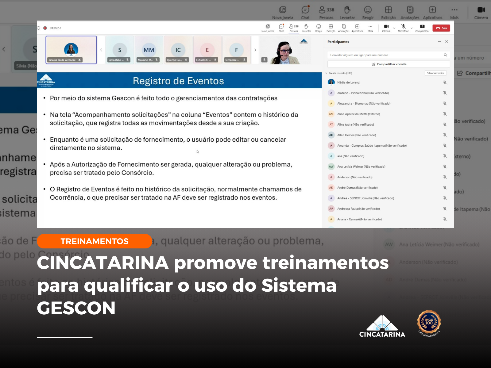 A Central de Compras do CINCATARINA tem promovido treinamentos online com os usuários do Sistema de Gestão de Serviços e Contratos Públicos – GESCON, reforçando o compromisso do Consórcio Público em orientar os municípios consorciados e garantir maior eficiência nos processos de compras públicas.