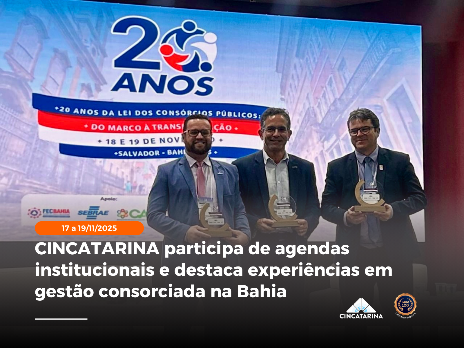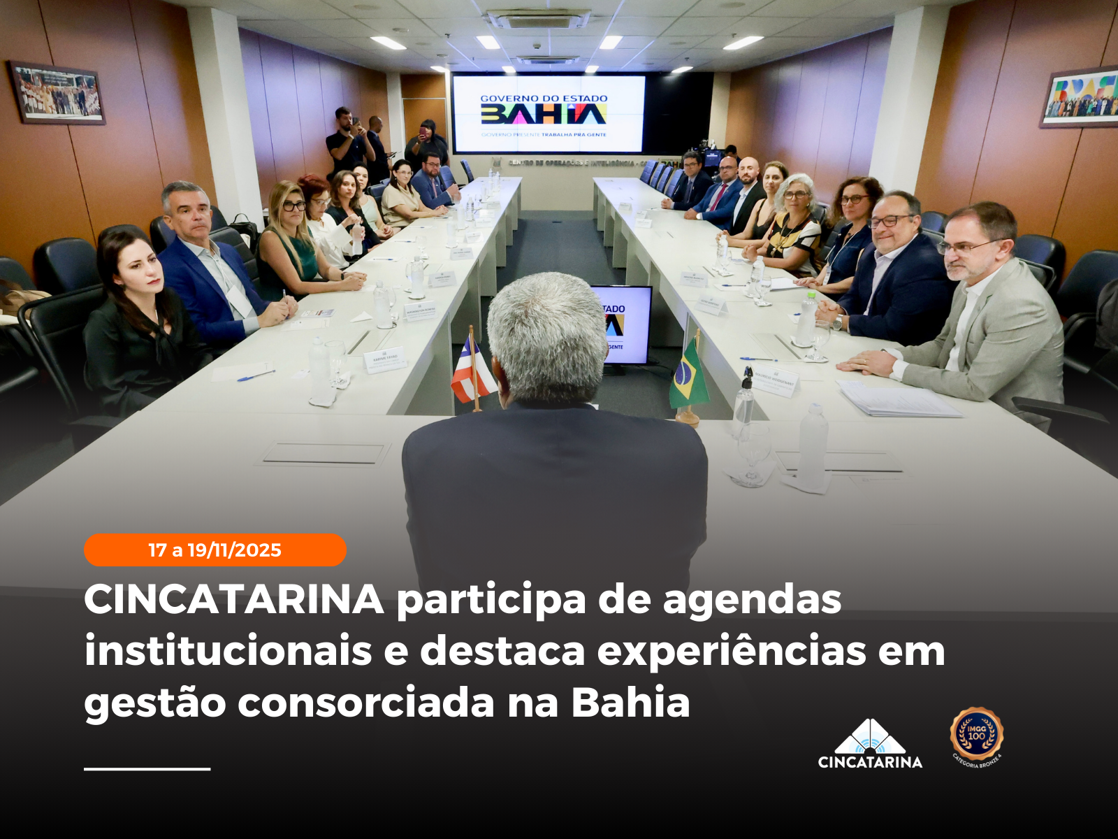 Nos dias 17, 18 e 19 de novembro, o CINCATARINA integrou uma série de agendas institucionais na Bahia, fortalecendo a articulação entre consórcios públicos e compartilhando práticas consideradas referência nacional em gestão consorciada.