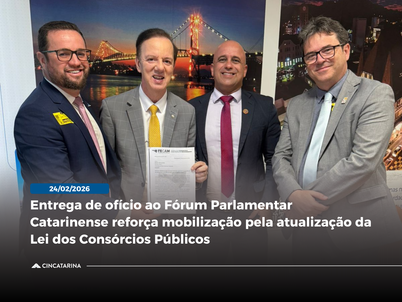 Nesta terça-feira, 24 de fevereiro, em Brasília, a Federação Catarinense de Municípios (FECAM), por meio do Conselho de Consórcios Públicos, realizou a entrega de ofício ao coordenador do Fórum Parlamentar Catarinense, deputado federal Ismael dos Santos, solicitando apoio às proposições de alteração da Lei nº 11.107/2005, que dispõe sobre os consórcios públicos.